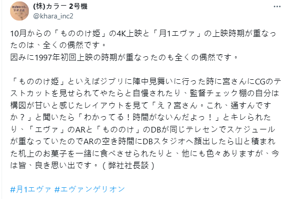 “10月要上的《幽灵公主》4K版,刚好和我们‘每月一部EVA剧场版’的重映撞了档期,真的纯纯巧合——就像1997年那次一样,完全没提前商量。”