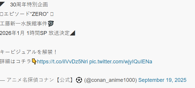 经典动漫《名侦探柯南》的新作衍生外传《名侦探柯南 外传ZERO 工藤新一水族馆事件》官方宣布将于2026年1月开播,敬请期待。