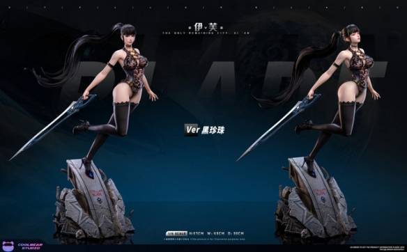 这款雕像高度约45-50厘米(视版本而定),采用高品质树脂材质,细节处理堪称一流。战斗服版以伊芙的标志性紧身作战服为主,布料纹理逼真,紧贴肌肤的设计凸显出她修长匀称的身材曲线——从肩部到腰臀的流畅线条,仿佛随时能跃入战斗。特别值得一提的是,黑珍珠版的蕾丝元素融入:伊芙身着半透明黑丝紧身衣,蕾丝边饰在灯光下若隐若现,散发出一种致命的诱惑力。她的银色长发轻轻飘散,眼神锐利中带着一丝神秘,右手握剑的姿势动态十足,让人联想到游戏中那些惊心动魄的斩杀瞬间。