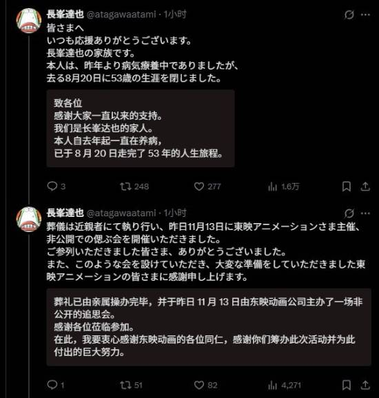 此次公布距离世三个月,遗族称其“坚强抗争至最后”,或因隐私考量延后消息。粉丝社区已涌现缅怀浪潮,B站与Reddit上充斥重温剪辑,标签#长峯達也永遠如“永别,海贼之魂”瞬间登顶热搜。东映动画表示,将珍视其遗产,继续守护这些IP的未来。