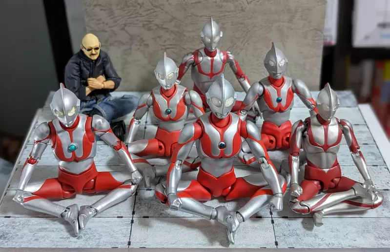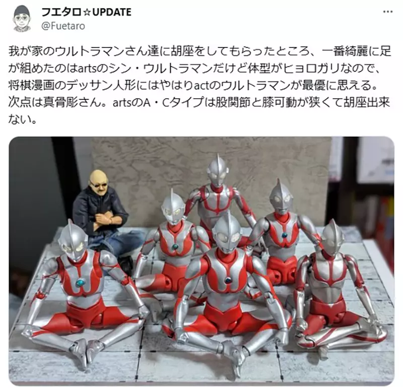 「我让家里几个奥特曼试着盘腿坐,结果最稳的是 S.H.Figuarts 的新·奥特曼,虽然他身形比较瘦小,但用来画将棋漫画这类坐姿场景真的超合适。第二名是真骨雕系列的。但 A 型跟 C 型的髋关节太卡,根本没办法坐好。」