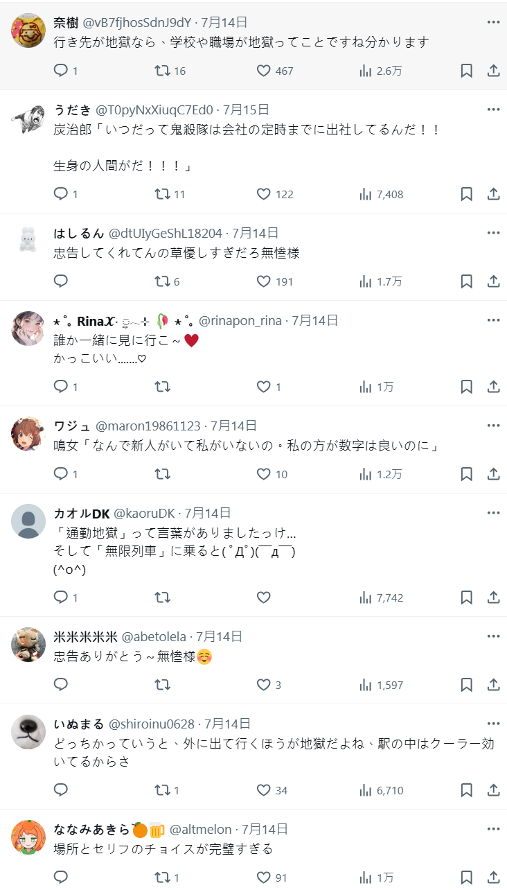 广告一经亮相,立刻在社交平台引发热议。有网友笑称”新宿站的构造本就与动画中无限城的诡谲结构高度相似”,也有人调侃”从东口进去是要直奔地狱吗”,更有人会心调侃”这是在提醒大家,每天要去的学校和职场才是真·地狱吧”,还有人直言”确实是地狱——早晚高峰的通勤地狱罢了”。网友们一边被这波创意逗乐,一边感叹官方太懂玩梗。